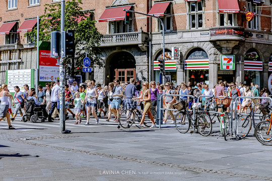 我们继续没有正形儿的逛街道,遇到了正在过红绿灯的人们,丹麦的市中心可太热闹了,丹麦人的颜值也都太高了。