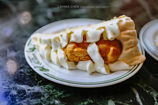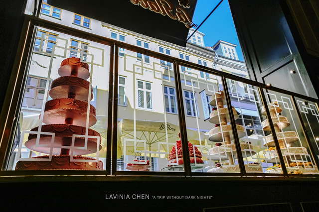 然后我们在热到生无可恋的时候,偶遇了丹麦最有名的甜品店,那必须不能错过呀,我们点了几角店员推荐的蛋糕。我选的是一块有泡芙的原味蛋糕,真的是好大一角,一个盘子都没装下,这个就是很正常那种大盘子,不是甜品的小盘子。丹麦的一角蛋糕和我们印象里的数量不太一样哈哈哈。