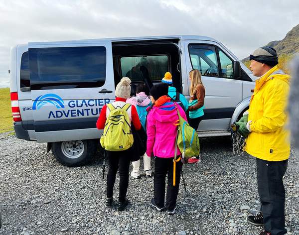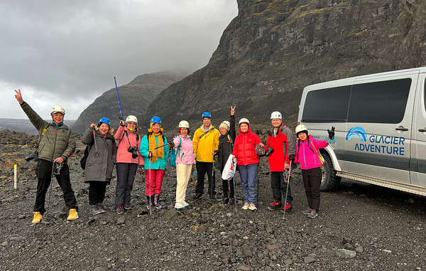 在俱乐部领了冰爪、手杖,每人发了一顶安全帽,出发前在车前集体合张影,坐 上高 底盘的特种车出发了,向导兼司机是一位年轻漂亮的金发女郎。