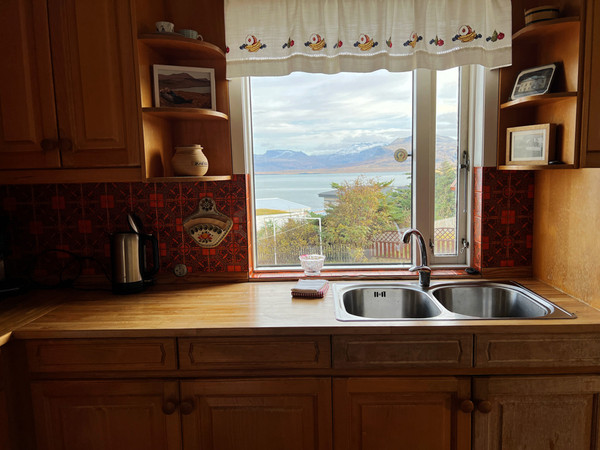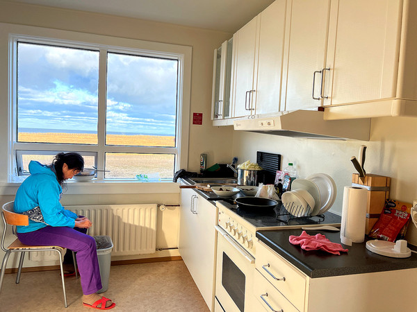 当我们走近公寓时,立刻就喜欢上这个公寓了!这是我们此行到目前为止住的最舒服的、地理环境也是最特别的。就在 一号公路 旁。南面是火山地貌,北面是大海。楼上楼下宽敞的住房,几乎每人一间房,不是看山就是看海,甚至可以边干厨房活、边看大海,舒适干净的住房非常舒服的享受。这样的地方真想多住几天。