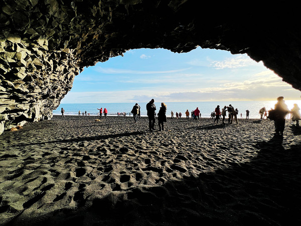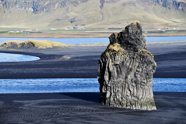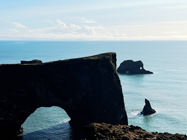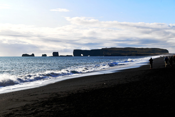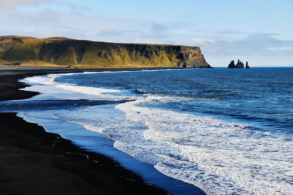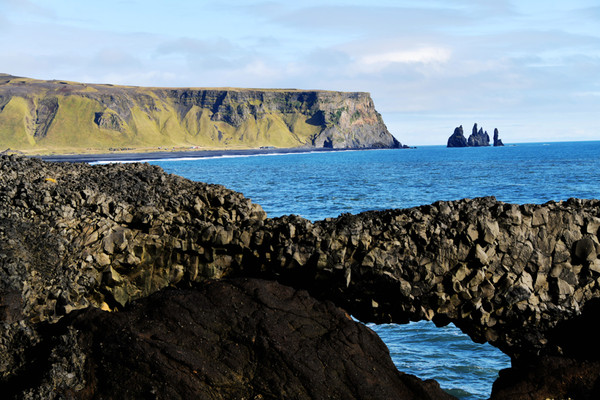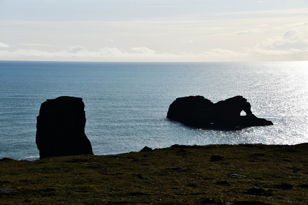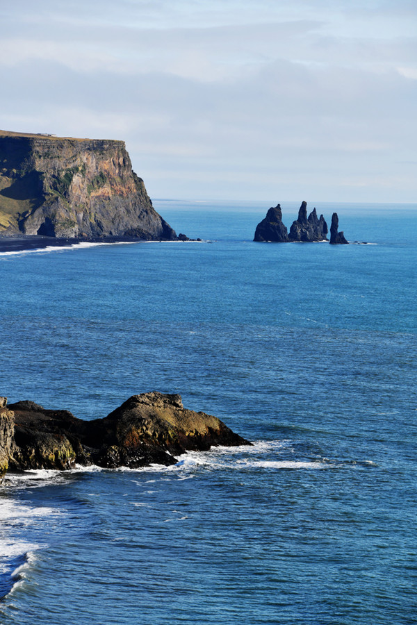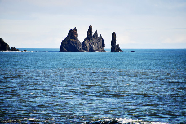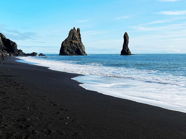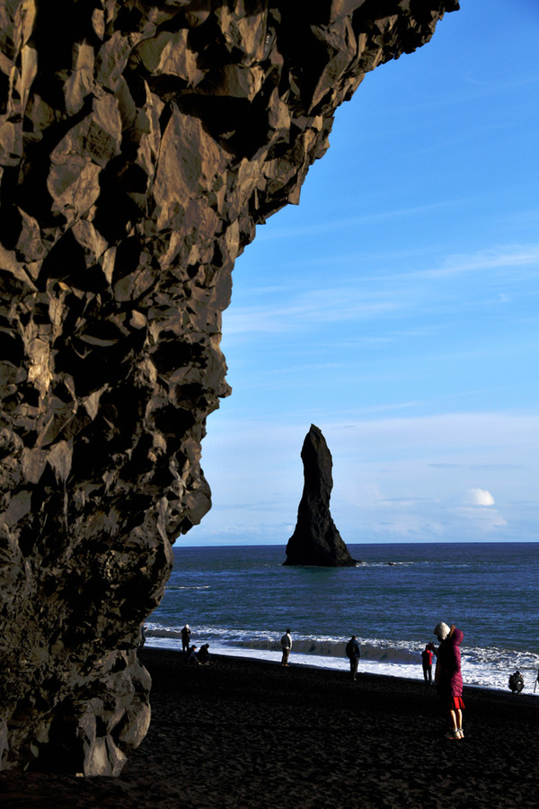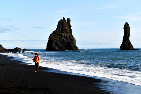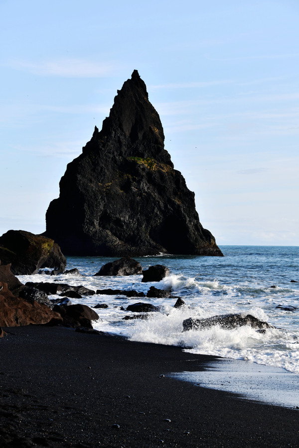 两座矗立在海中黑黝黝的礁石如两座雕像,与山上远眺完全不一样。远眺似乎是三座紧挨在一起的礁石,近看则变成了相隔的两座,真是移步换景。从这里眺望,北大西洋一望无际。黑沙与白浪在阳光下行程强烈反差,白色的海浪如白绸缎一般在黑色沙滩上飞舞。两座礁石隔海相望,交相呼应。