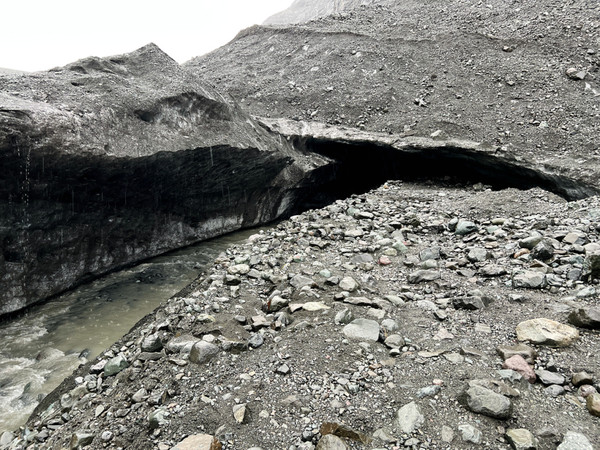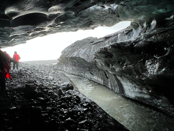 经过近一个小时的艰难行走,终于到达洞穴口,一个黑乎乎的不停滴着水滴的冰洞口,洞外是一条冰川冻融后流淌着的河。