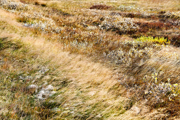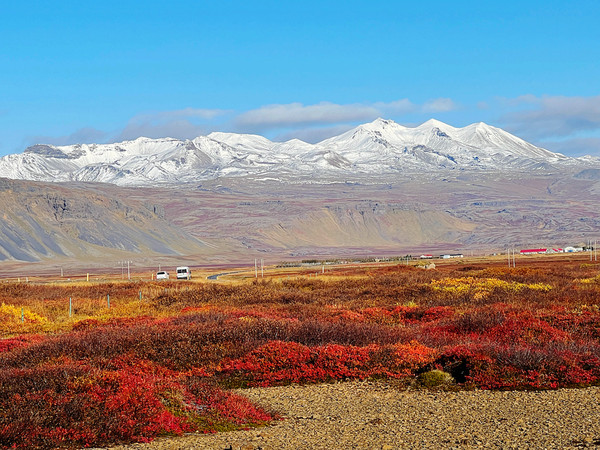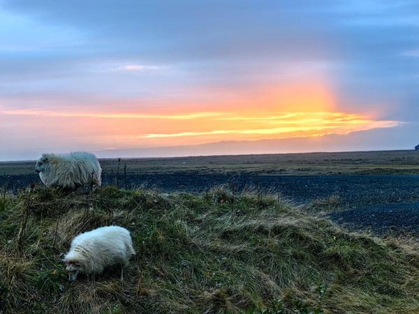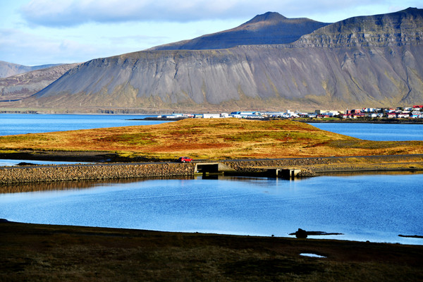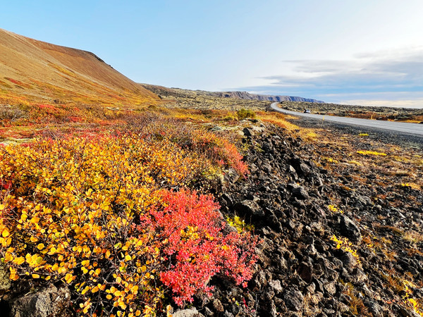 沿着大西洋的海边道路前行,天气很好,秋日的 冰岛 植物更多样性,红色的黄色的小灌木点缀着 冰岛 绿色的苔原。道路两侧毛茸茸的草滩已变成黄色,一片金黄,时不时见到一群群肥嘟嘟的羊、卧睡在草原上。