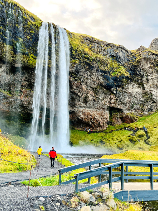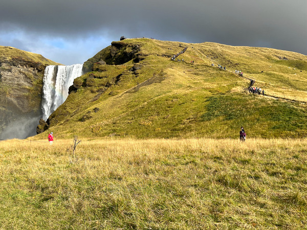 今天这里的游人较多,瀑布前布满了人群,瀑布右侧有条小径可以直达瀑布上方,不少游人登上顶,从观景平台眺望海岸线,观瀑布顺势而下的壮观景象。据说这条小径还是一条 冰岛 著名的徒步路线之一。