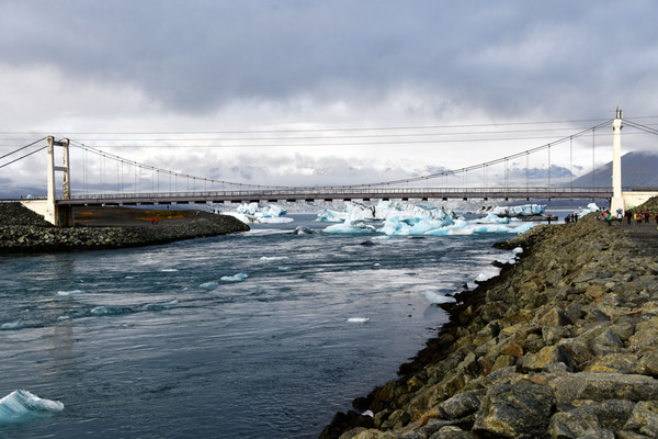 前行不远处有一座桥,桥下河水中拥挤着大量从冰河湖漂浮过来的浮冰,全球天气变暖加快了冰山融化,看着这些浮冰能让你切切实实感受到气候的这种变化。