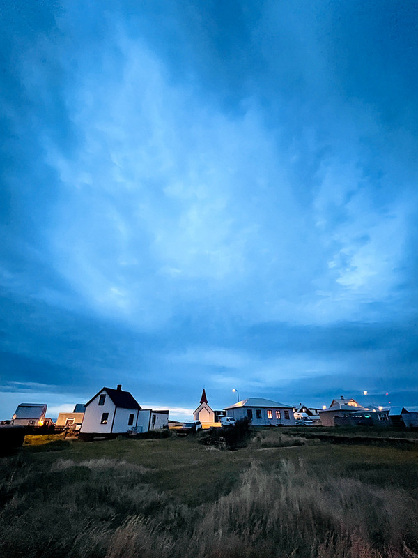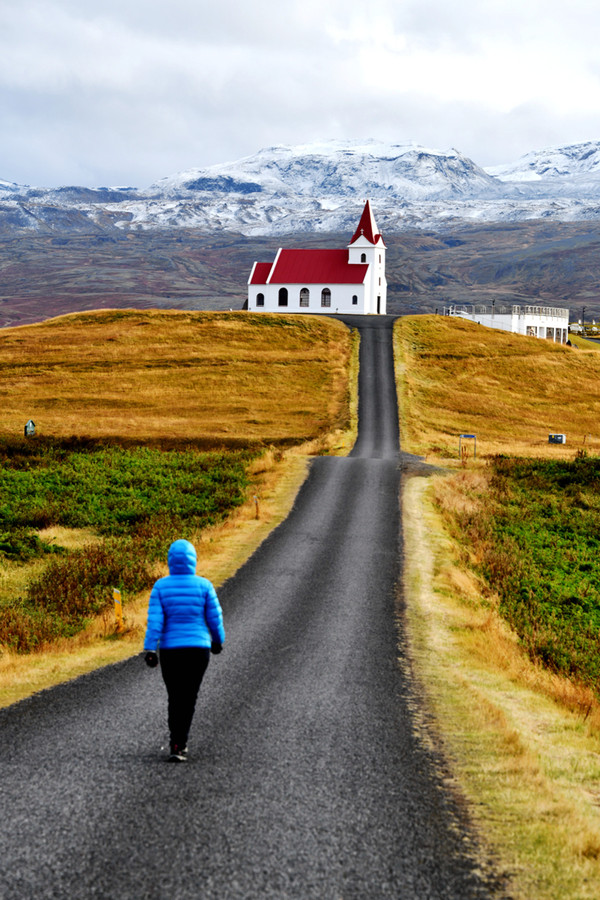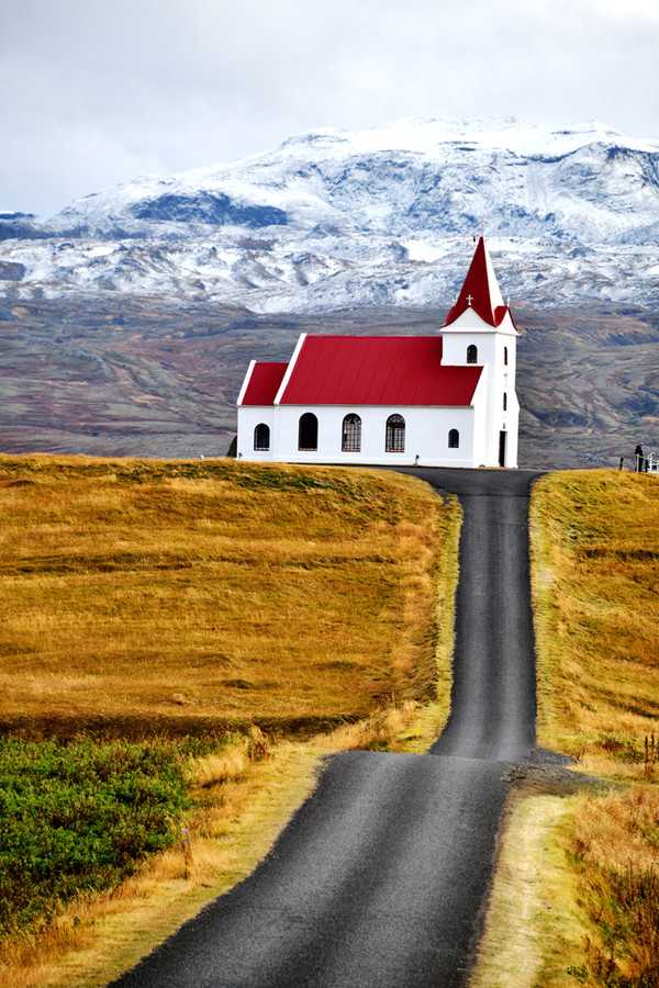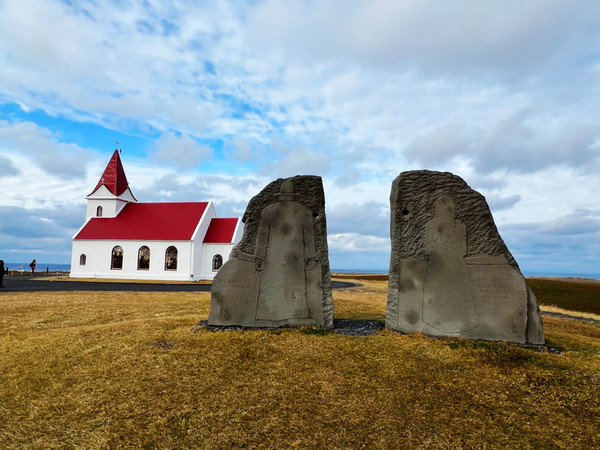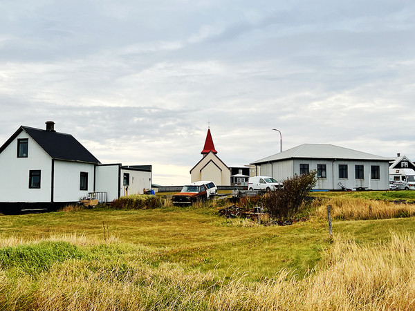 红顶子教堂名为海德利桑德教堂(Ingjaldscholskirkja),位于海德利桑德小镇以南山坡上,应该是有特点有历史的一座教堂。在公寓里我们见过屋主拍摄的这座教堂。据查教堂始建于1903年,是世界上最古老的混凝土教堂之一。它以斯奈山为背景,教堂在前面,安静的像在一幅画中,有一种世界尽头的孤寂感。据说在每年的6月,教堂周围的鲁冰花盛开时,是这里景色最美的时刻。