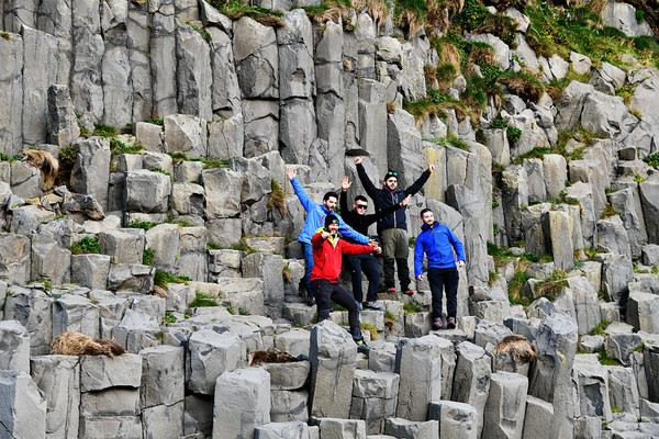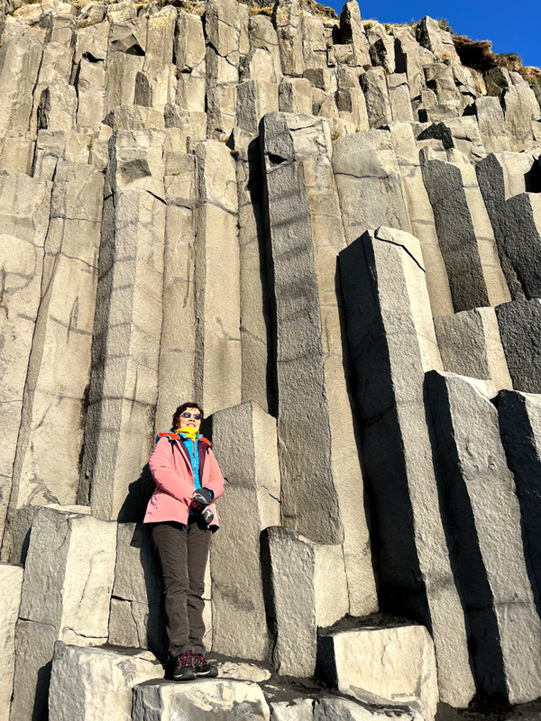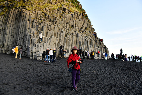 黑沙滩旁有一座熔岩山,挺拔而突兀,那些鬼斧神工的六边形玄武 石柱 ,好像人工凿出来的整齐划一,平添了许多神秘诡异的气氛。这是火山爆发岩浆流下之后迅速冷却凝固,形成了这样的仿佛人工凿就的柱状节理形状。深深感叹大自然的无穷魅力与力量。