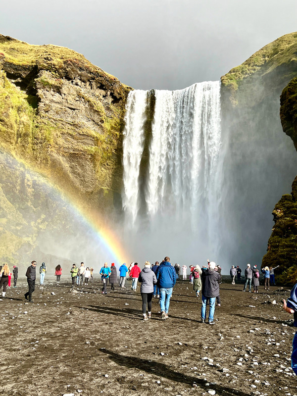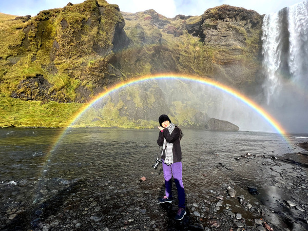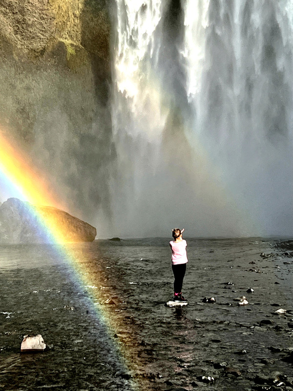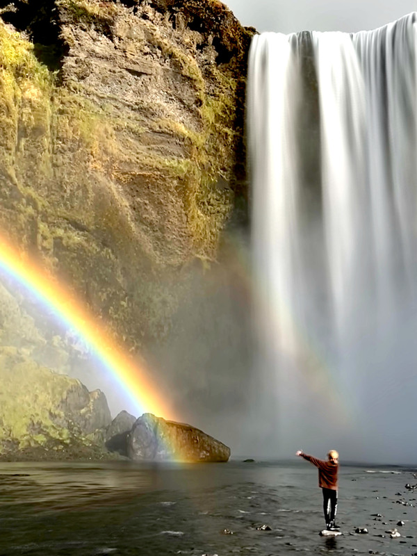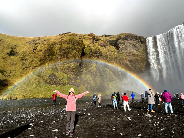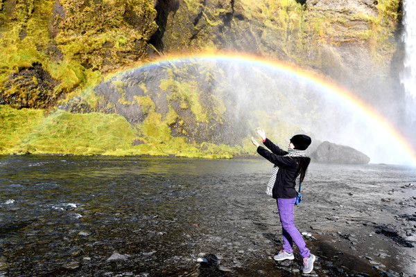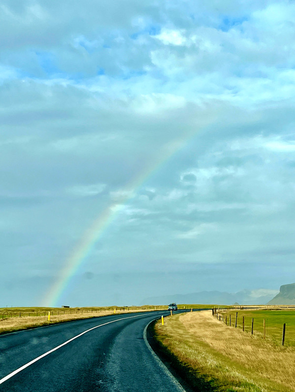 马上开车转进去,发现瀑布旁有一条漂亮的彩虹,太令我们开心了!太阳下这条彩虹经久不衰,并时不时变成双彩虹,或形成一个彩虹圈。这就是 冰岛 最漂亮的瀑布-斯科加瀑布。