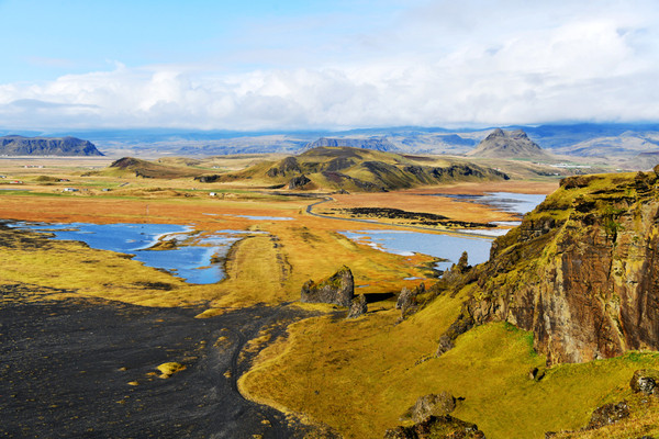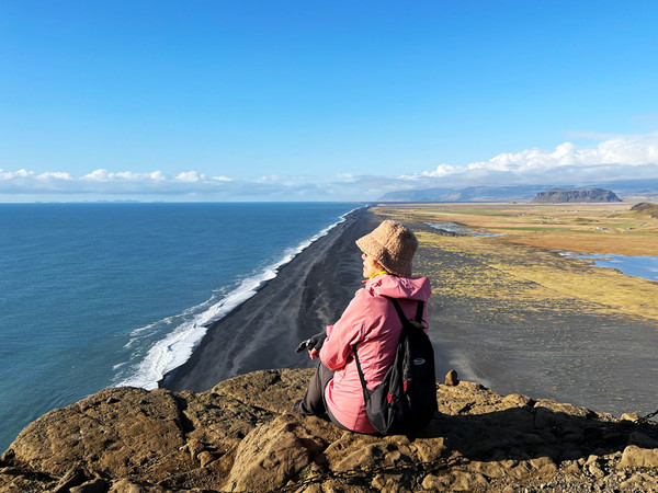 这里远离人群,视野更开阔。从高处可以俯视整个 冰岛 南部海岸线的黑沙滩和蓝色大海,很有气势。蓝色的海岸黑色的沙滩,蜿蜒伸向远方;多彩的熔岩湿地地貌似曾相识。