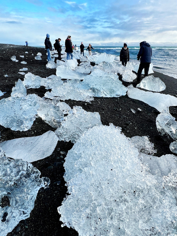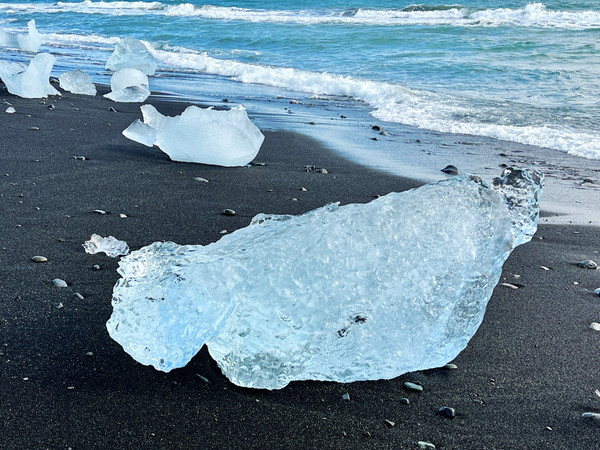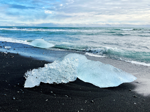 过了桥下到海边的黑沙滩上,一颗颗大小不一形状不规则晶莹剔透如钻石一般的冰块洒落在黑沙滩上,经受着海水的拍打冲刷。这些由冰河湖冲刷下来的冰块,有些经过多日的风吹日晒海水冲刷,接受游人的欣赏,慢慢消融在沙滩上,这就是被称为著名的“钻石黑沙滩”,也许这是世界上独一无二的景色。而大部分冰块则从这里汇入大海,这里是瓦 特纳 冰川崩裂的冰块的入 海口 。