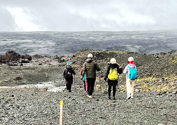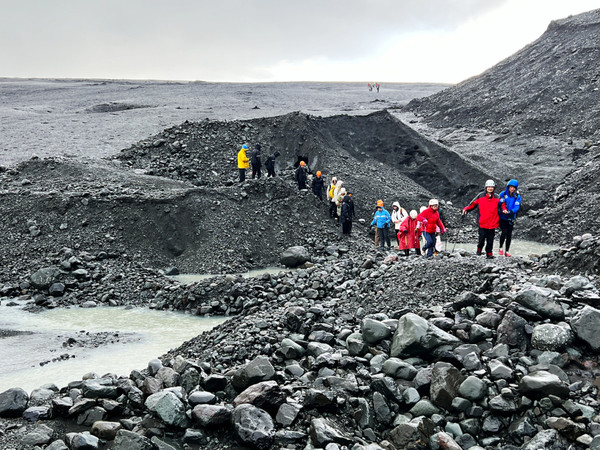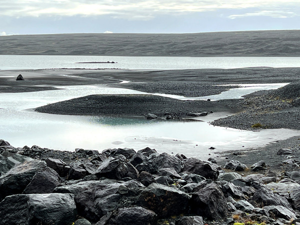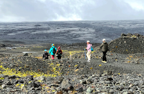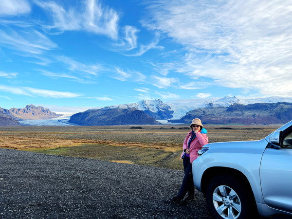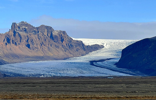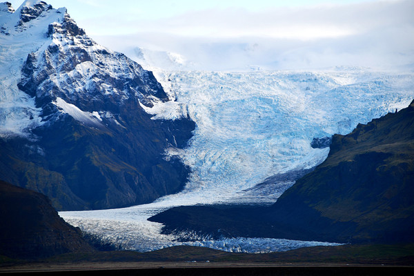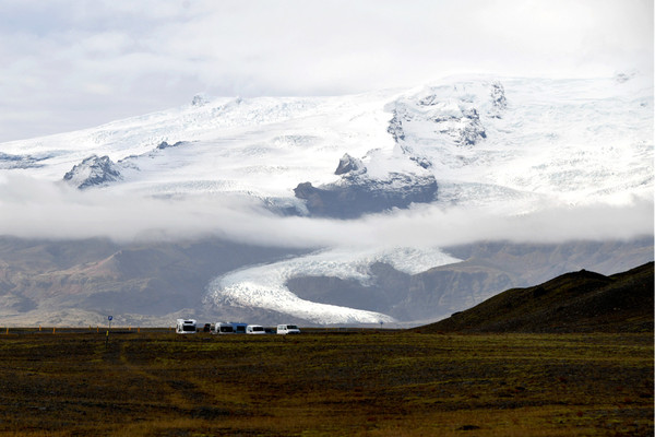继续前行,远远就望到远处山脉顶上那层厚厚的白雪,由远而近好像从山上泻下的一股白色洪流,越来越清晰!是冰舌!它们似巨大的白色洪流,冲破山峦的重重阻碍,向山下奔腾而去,马上就要冲到公路上了!那是何等的气势,何等的壮观!也许这是瓦 特纳 冰川国家公园的一角——史卡法特Skaftafell?我们停下脚步,尽情享受山野带给我们的快乐。