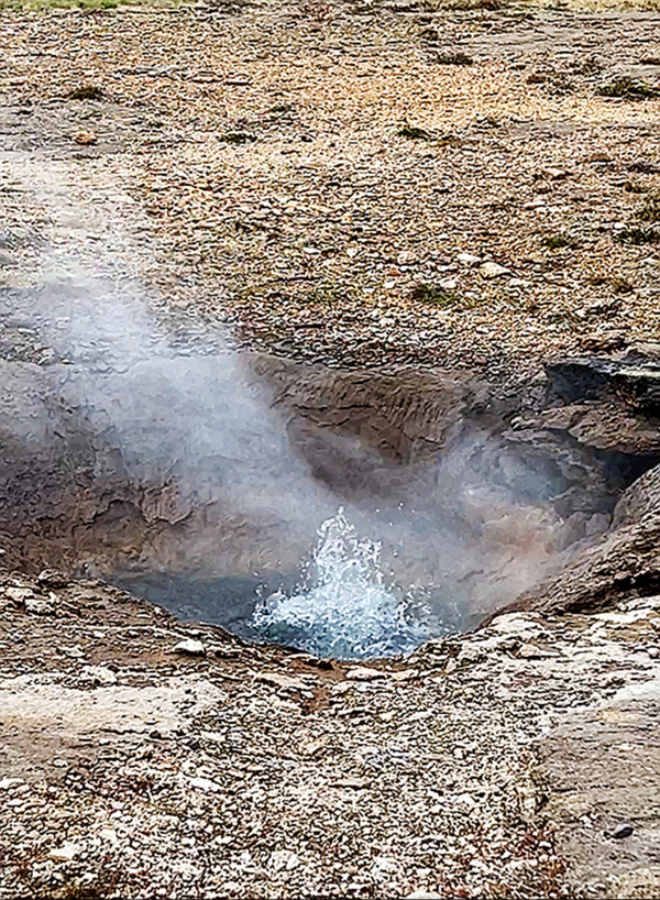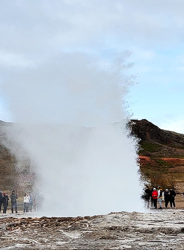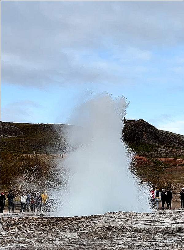 在风中我们在大间歇泉旁等待着,看着泉眼咕噜咕噜地冒着热泡,不知道它什么时间喷发?它的喷发间隔时间没有规律,但是喷发前会发出隆隆的响声,似乎在告诉人们:我来了!正在喷发时响声渐高,沸水随之升腾,喷向高空,据说水柱最高可达61米,居 冰岛 各喷泉之冠。