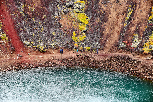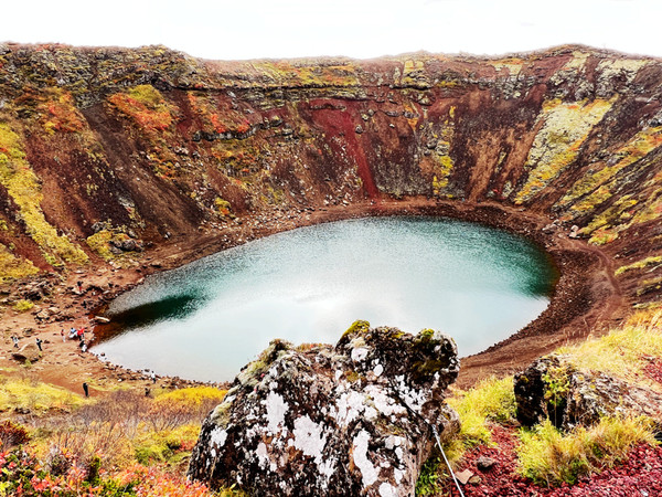 原来是一个火山口湖,有着几十米深度的凯瑞斯Kerið火山口湖。据介绍,Kerið火山口湖形成于6500年前的一次火山爆发,后经雨水积累而形成这个深度约55米、直径为170米至270米的椭圆形火山口湖。为世界上较闻名的三个火山口湖之一。这个火山口湖有一面相对平缓的岩壁,人们可以顺着这面岩壁接近湖面。湖水清澈透明,由于吸收了周围土壤的矿物质,湖水呈鬼魅般的幽绿色,并会随着光线的变化而变换颜色。在湖周围修建了步行道供游客环湖游览。