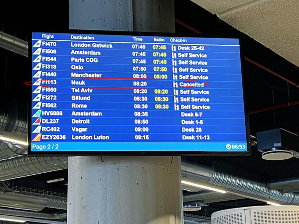 5点起床,为的是赶 冰岛 飞往 格陵兰岛 努克的早班机,不到7点来到灯火通明的机场。原以为就这样和 冰岛 说再见,没想到。。。。。。
