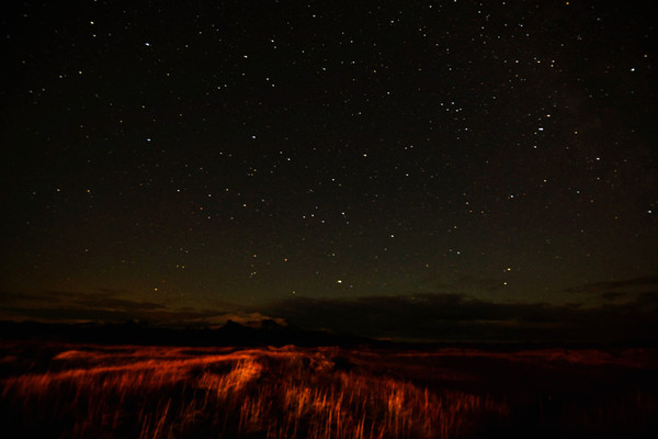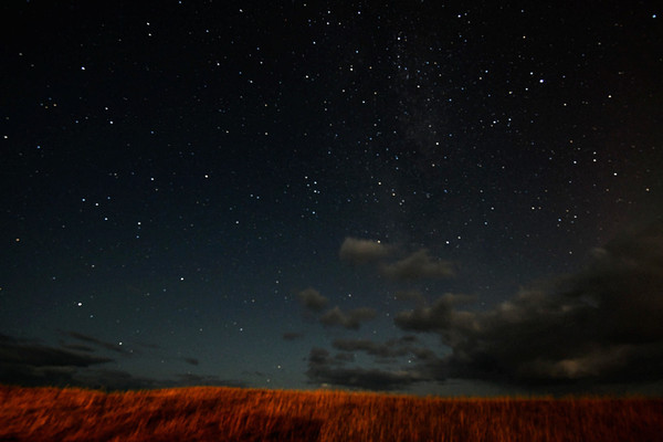 当天夜里天高云淡,银 河北 斗七星挂在夜空,真是一个适合拍极光的好天气。我们跑到屋前草地上等候,等待极光出现的时刻。
