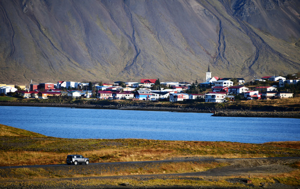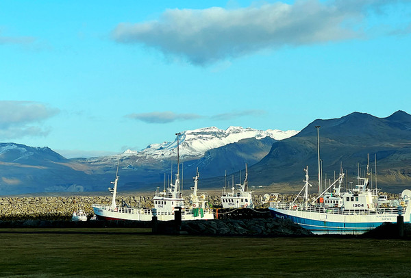 欧拉夫斯 维克 (Ólafsvík)小镇是一个渔港小镇,小镇被山脉环绕,山顶上覆盖着白雪。小镇周围停泊着数艘渔船。