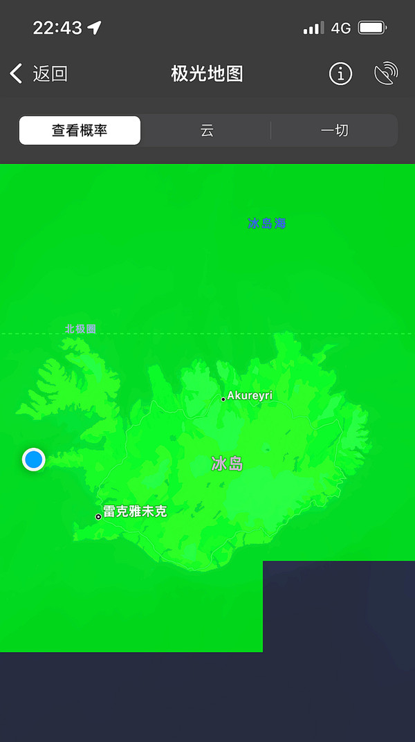 从当天极光地图中可以看到,今天是一个观测极光的好机会,极光几乎覆盖了整个 冰岛 ,当天晚上有极大可能看到极光。让我们又增添了一份期待。