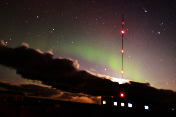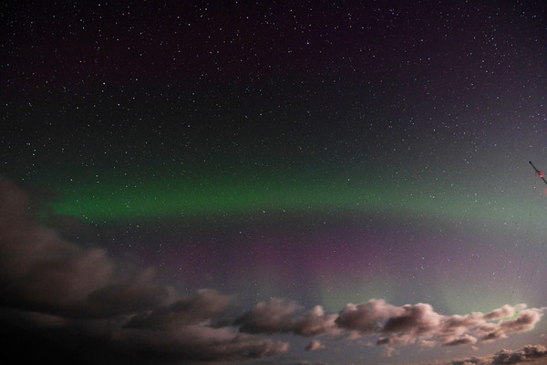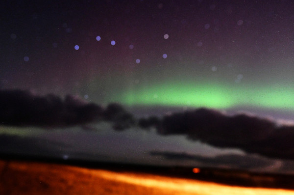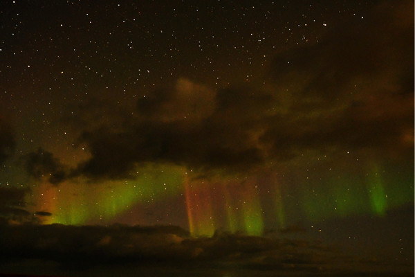 迅速转移到屋后,我看到了在一条黑色云带上下,绿色的极光散发出耀眼的绿光,娇艳而妖艳,遗憾的是待我架好相机,她消失了,只抓住她一点点绿色的不是那么清楚的尾巴。但她并没有走远。