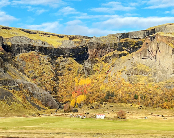 今年第一抹秋色是在 冰岛 看到拍到的, 冰岛 的秋色给 一号公路 给旅途增添了色彩。秋天的 冰岛 太有魅力太漂亮了!一望无际平原上突兀的绿色高大山脉,山脉间不时出现的大小瀑布,配上艳黄的树丛,田野里一卷卷草垛,蓝天下都是那么的夺目,以往只能在挂历里在电视中看到的景色,今天看到了真实版!我们的脚步都挪不开了。