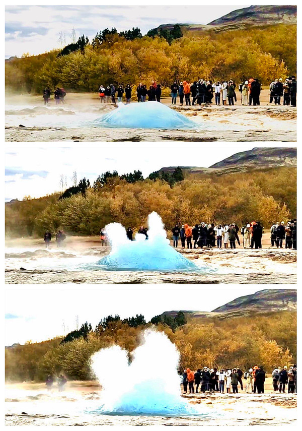 看大间歇泉一定要有足够的耐心,将手机设在录像,端在手上,随时准备按下拍照键,反应要快!我因缺乏耐心反应较慢,看到两次泉涌喷出,都没有完整的记录下来。只能借用团友惠冰的录像截屏。