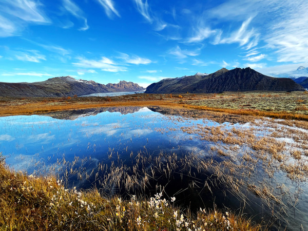 只见天上的云彩也跟着我们欢乐起来,好像跳跃的羽毛,联想起太阳公公微笑起来不就是这样吗?云彩带着微笑伴随我们来到一片水洼地,远处的山脉、冰舌和眉飞色舞的云彩都倒影在平静如镜的水中。大自然太奇妙了!