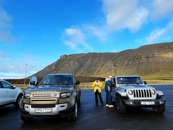 既然走不成,临时决定租车前往 冰岛 西部,那里的教会山(草帽山)值得第一次来 冰岛 的团友去看看。立刻租车租房。正遇上 冰岛 旅游旺季,合适的车辆早被提前预约,找了几家租车公司好不容易才找到能装下5人行李的越野车,一辆Jeep,一辆路虎,我们的车又升级了!