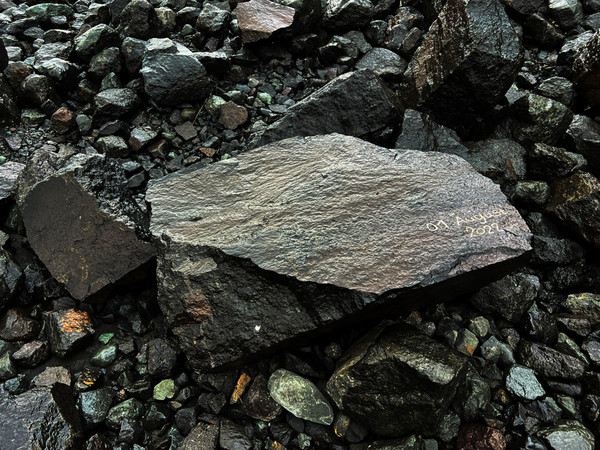 这是一块向导特别指给我们看的石头,上面刻着2022年8月1日,是当年雪线的位置。如今因为全球变暖,雪线已上升至近百米以上的山坡上!