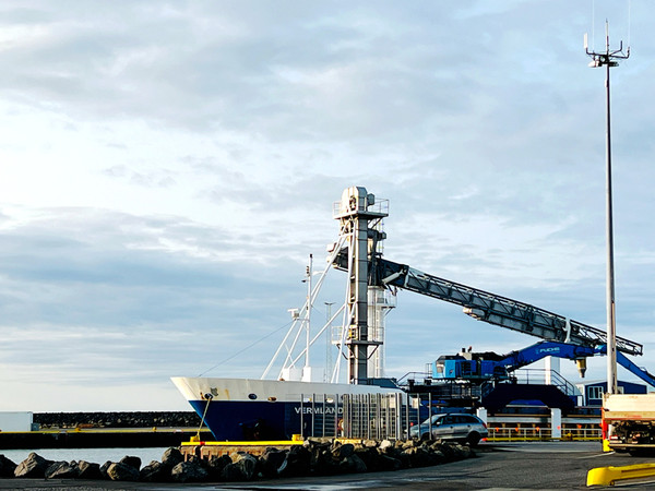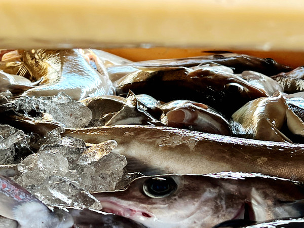 在渔港见到一群海鸥正围着一艘渔船欢快地飞着叫着,阵阵鱼腥味扑鼻而来。一台吊机正在将一个个卸下海鲜的大盒子从地面吊入渔船上。