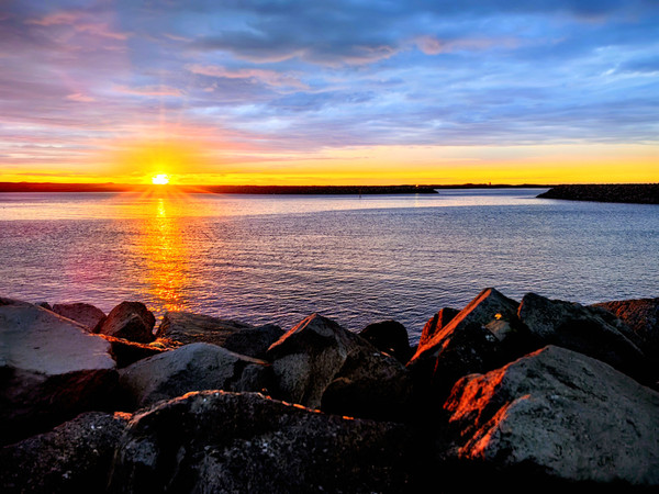 早上推开窗就看到远处的天边微露出橙红色的早霞,染红了半边天,形成天空中一层层彩色云带。江滨冲出门朝着太阳升起的海边跑去,记录下太阳跃出海面的瞬间。这才知道,我们住的公寓距海边不远。躲在屋里的我们只记录下红霞满天。