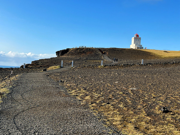 行车20多公里,我们来到下一个点。我们没有直接开车去到海边的 维克 黑沙滩,而是从 一号公路 转上218公路(上山的沙石小路)。先开车上山,山巅有座红顶白墙的 灯塔 ,从高处俯瞰大海、俯瞰黑沙滩、眺望熔岩山。有人把这里称作“教堂海滩”(Kirkjufjara Beach)。原来根本不知道有这个点,非常感谢江滨的选择,并赶上了好天气。