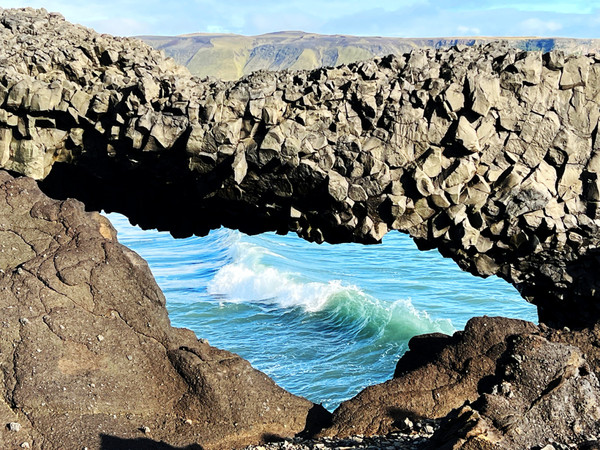 回到停车点向着低处沿着海岸线行走,见到一个海蚀的柱状节理结构的拱门,海浪不断拍打着并涌上这个天然形成的拱门。这一带被称为教堂海滩,一边由黑沙组成的沙滩连接着黑沙滩景点,另一边由岩石组成的海岸。
