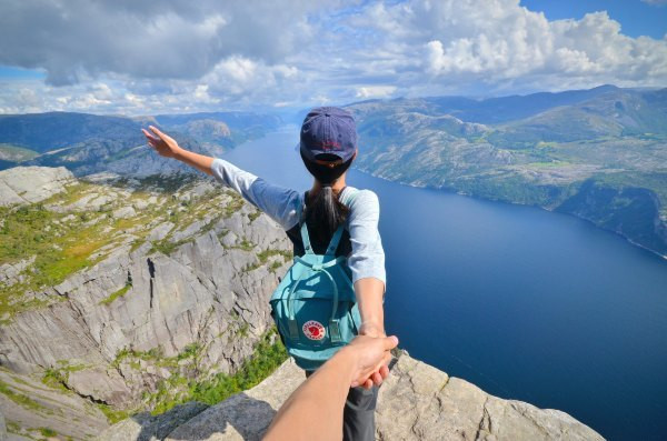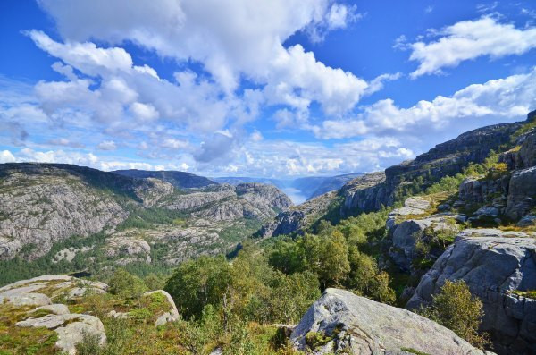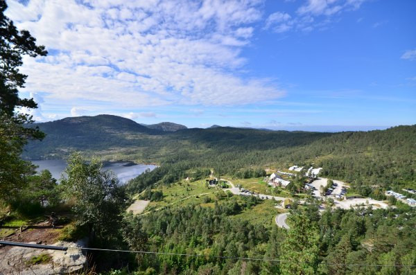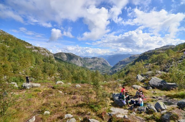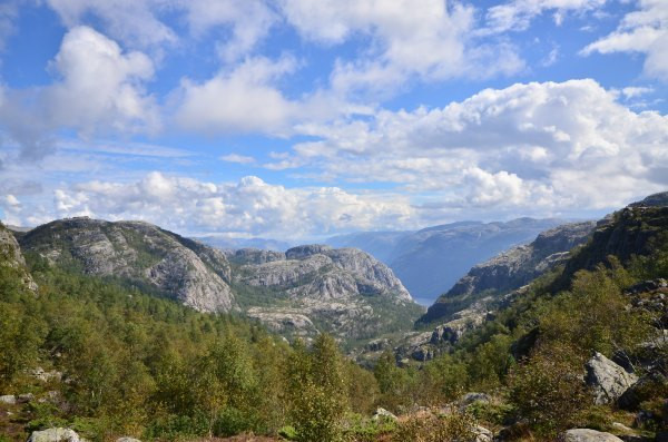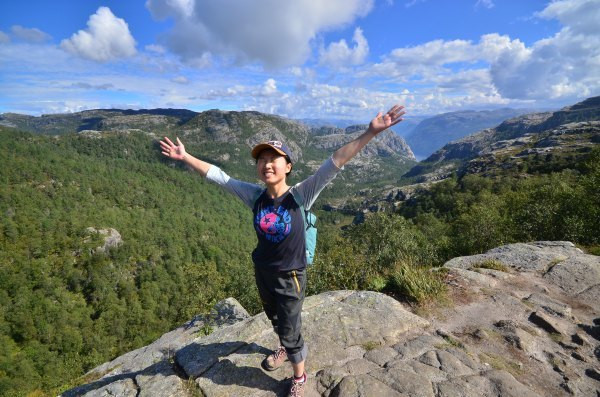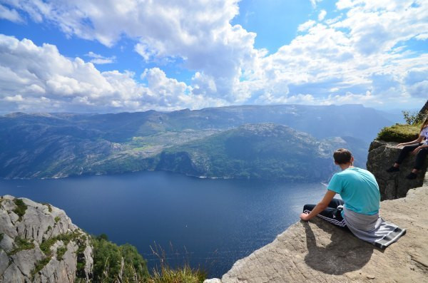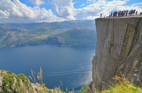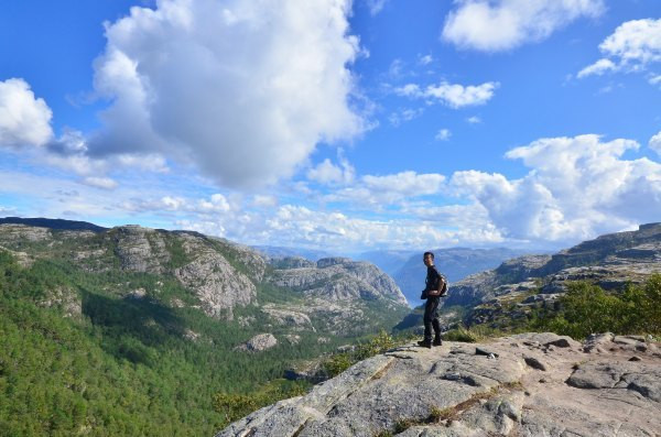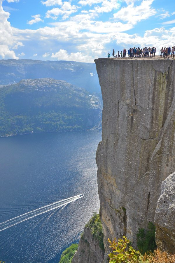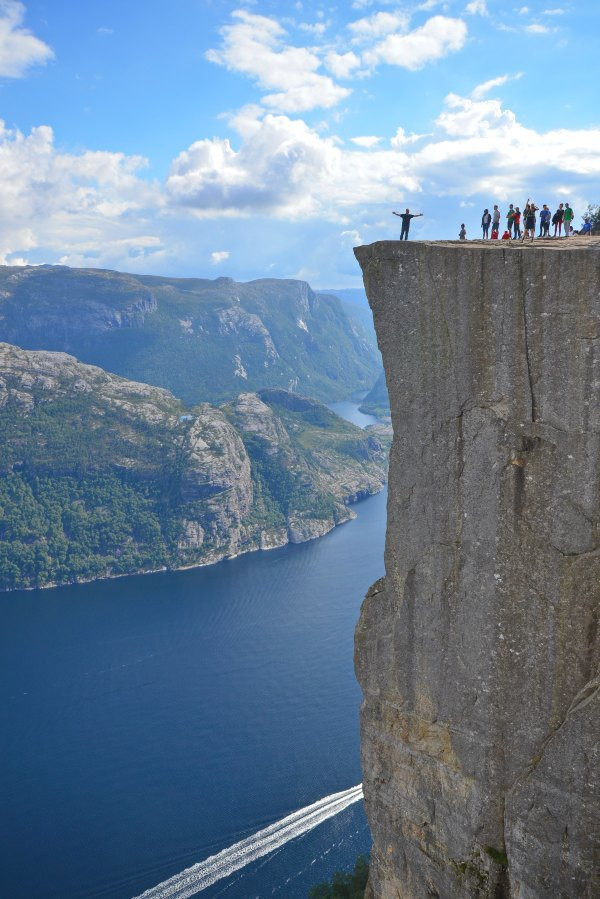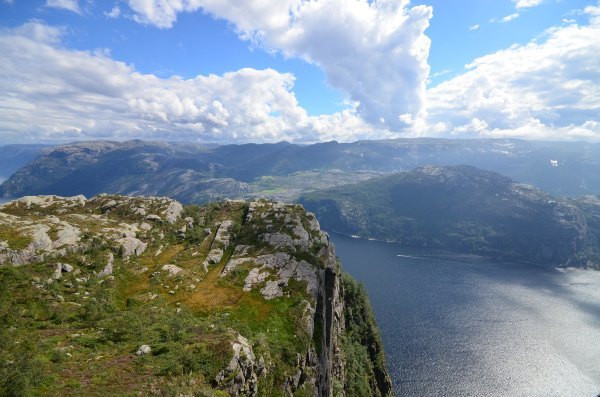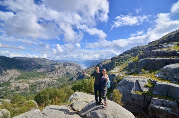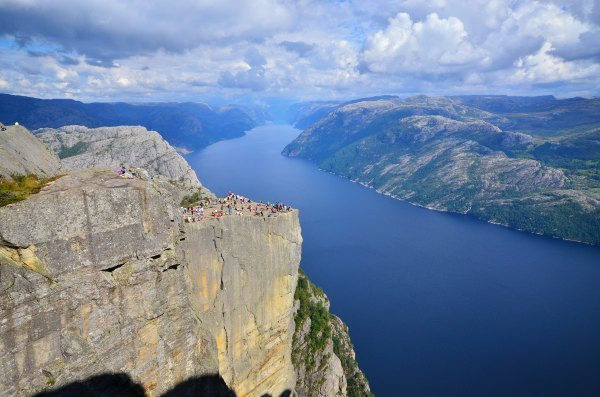 终于抵达圣坛岩,壮阔的峡湾景色尽收眼底,而且今天天公作美,满天的云朵实在是太给力了!若问置身圣坛岩是和感受,我只想说两个字,腿软!!!不少胆量过人的外国人都坐在危崖边上,两腿垂放而下,我自愧没有此胆量,此动作已大大超出我的安全阈值!我一直在想这个问题,这种景点(实际上也不算是景点,因为根本就没景区管理人员,也没有门票费用)在国内一定会用护栏围起来,但是热爱大自然的挪威人一定不可能允许这种东西破坏大自然的和谐美,那么问题来了,长年下来真的不曾有人一不小心从悬崖下摔下去?——看下去那真是万丈深渊……
