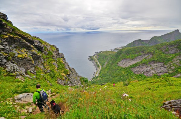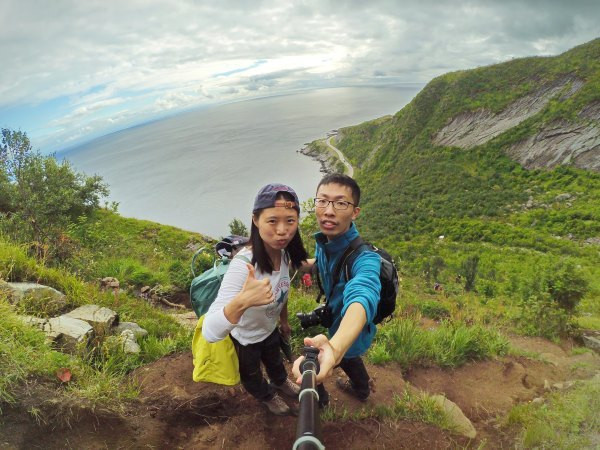 要说挪威真是不乏陡峭的山峰,罗弗敦群岛更是当仁不让,这座看似不起眼的小山爬起来还真是陡,有些路段确实非常危险,要手脚并用才可能翻过,如果是雨天湿滑,我相信一定是有人掉下去过,所以才会有山脚下的那处警示牌。可惜今天天公不作美,在半山腰上就下起了雨,幸好我们穿着冲锋衣和软壳来,和老婆商量了下,决定还是坚持继续上山。