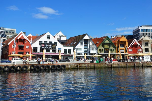 和闻名世界的卑尔根相比,斯塔万格在旅行挪威的国人清单中一般不占据主要地位,因为挪威有多的数不清的峡湾,处在挪威南部的斯塔万格交通并不便利。不过在我看来,斯塔万格是挪威城市的明珠。在一个阴郁的早晨,我们整理好行李,一路推着箱子到了卑尔根火车站附近的长途车站,我顺便到附近的便利店,买了一些面包、酸奶和热狗果腹,顺利搭上了前往卑尔根的长途大巴,开启5个多小时的漫漫长路。一早的体力劳动让我们在车上恹恹欲睡,先前研究过地图,虽然看到卑尔根和斯塔万格之间被支离破碎的陆地和海湾所阻隔,我仍然以为只不过是大巴在陆路上绕行而已,结果等我略有清醒的时候,我发现自己已经站在一艘渡轮的甲板上,耳边是簌簌寒风——渡轮正穿越在岛屿间,而此时大巴正在汽车仓里,所有乘客都上到上层。在接下来的旅程里,大巴转渡轮,渡轮在转大巴,不知道转了多少趟,才终于到了斯塔万格。我在想,挪威不愧是峡湾之国,在这里渡轮作为交通工具甚至比汽车还重要吧!