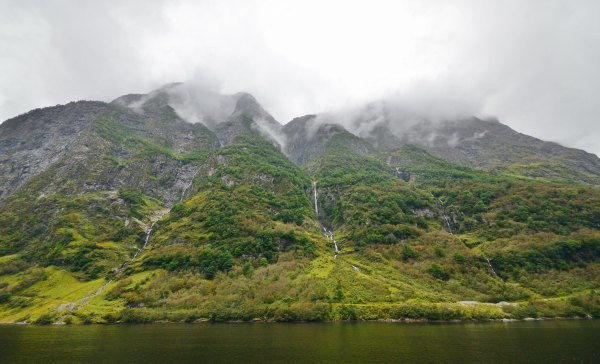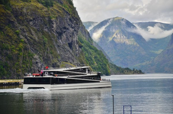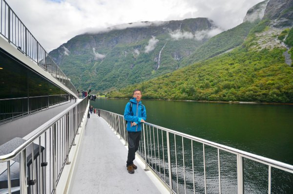要说这艘船可了不得,号称最新设计的峡湾游览观光船,之字型造型真是够前卫,满足了容纳更多游客在甲板上近距离观看峡湾的需求。代价也是船票比普通游览船贵了许多!我们从古德旺恩上船,一路沿着奈略峡湾——联合国世界自然遗产——一路行至弗洛姆。