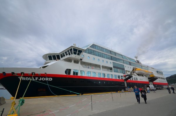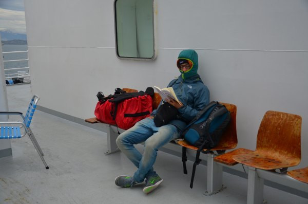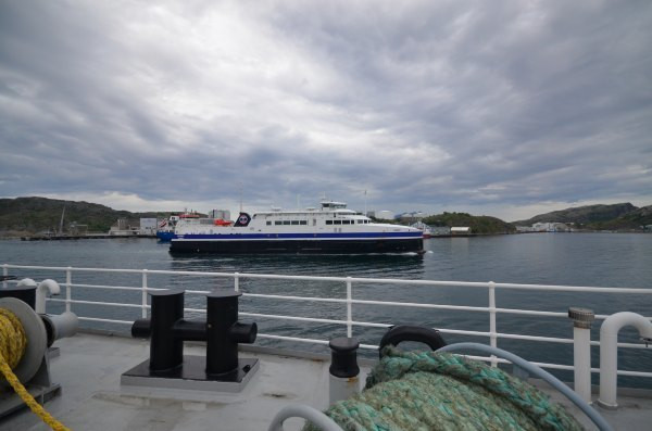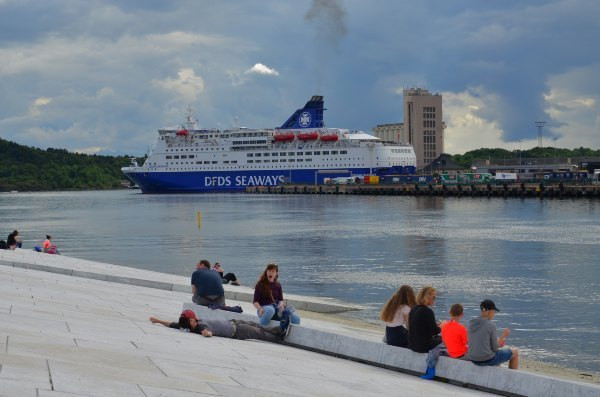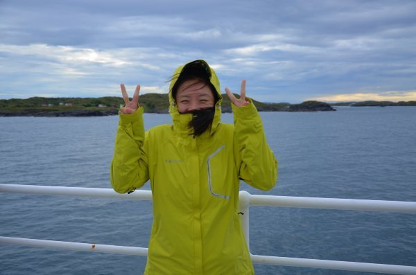 图为等渡轮中。码头外观十分低调,又处在偏僻的郊区(好吧,这里看起来哪里都像郊区),以至于我们拖着行李箱找了很久都不能确定。码头没有任何标示,周边甚至没有一家餐馆(这不科学!),懵懵懂懂的我们几乎直到最后一刻才知道要上哪艘船。期间遇到一个会说中国话的美国高中生,看到我们主动找我们搭讪和我们聊天(他那不会说普通话的美国同伴看起来十分嫌弃他说中国话- -)。PS这是我们一路上唯一1次遇到的会说汉语的外国人。他正在间隔年,搭游轮沿挪威海岸线旅行(多金男,因为挪威的此类游轮,不是一般的贵……)。