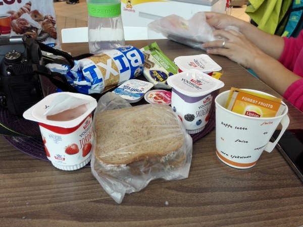 这是我们赖以果腹的手段,酸奶加面包或者饼干。这几样组合起来就是在挪威最便宜的一顿饭了,也是我们在挪威吃的最多的东西。酸奶富含蛋白质和脂肪,面包或者饼干则是淀粉,营养三要素配齐,这样长期吃至少保证能填饱肚子且不会出现健康问题。如图我们在机场就吃开了。