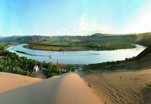 沙坡头集大漠、黄河、高山、绿洲为一处,具西北风光之雄奇,兼江南景色之秀美。有中国最大的天然滑沙场,有横跨黄河的"天下黄河第一索",有黄河文化代表古老水车,有黄河上最古老的运输工具羊皮筏子,有沙漠中难得一见的海市蜃楼。可以骑骆驼穿越腾格里沙漠,可以乘坐越野车沙海冲浪,咫尺之间可以领略大漠孤烟、长河落日的奇观。