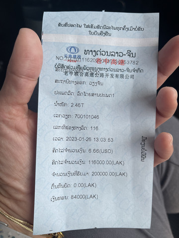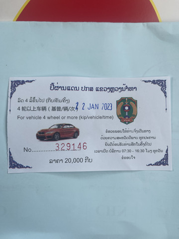 从小房子里交完钱出来然后开车过岗亭,小哥开口就要200000老挝币(无收据)这笔钱不知道是不是可以不给没搞明白。但我们在老挝境内七天被警察查了无数次资料,每次都顺利过关没被罚过,但有看到别的中国车因为资料不全被交警罚款了,不知道是不是在这里没给钱被小哥拿走了部分资料。