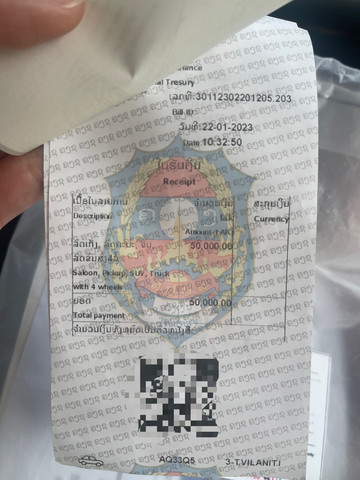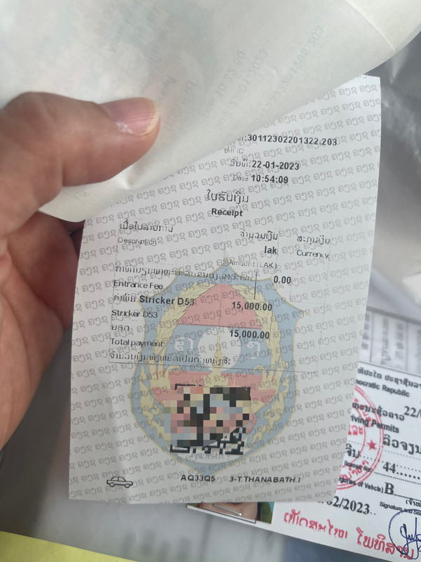 第六步:过关后司机回去取车,车过关卡时交费50000老挝币(有单据)。我们觉得这50000是车辆的关税,必须付。