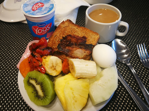 晚8点钟晚餐开始,餐厅很大,几呼可以容纳所有人同时就餐。每日三餐,早餐是自助式,和宾馆自助差不多,样样俱全,中、晚餐是每人一份,三道菜品,一般第一道是汤,第二道是主菜,以牛排、羊肉、鳕鱼等并配蔬菜居多,第三道是甜点或冰淇淋为主,一天一换样,决不重复。上海游派游行怕大家吃不惯西餐,特意从上海带几箱柞莱和老干妈,调理大家的口味。饭后船方给每个人发了晕船药,我对船的摇摆没有反映,也就没有吃晕船药,早早上床,在轮船摇摇晃晃中渐渐地进入了梦乡。
