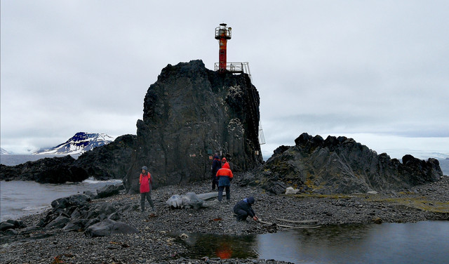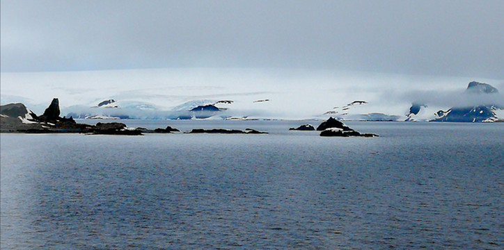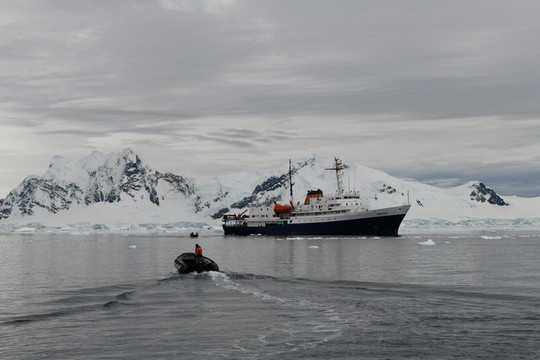 下午3点多钟,乌斯杯亚号穿过了德雷克海峡,周边出现了越来越多冰川覆盖的小岛,渐渐地进入到南极的南设得兰群岛。4点钟船上广播通知,半小时后开始登陆该群岛的巴里恩托斯岛。八艘冲锋艇依次入海,探险队员先行探路,并在岛上插上路标。大家全副武装,单号房间的人员先行,双号房间的人员断后,每艘乘坐8人,冲向岛屿。