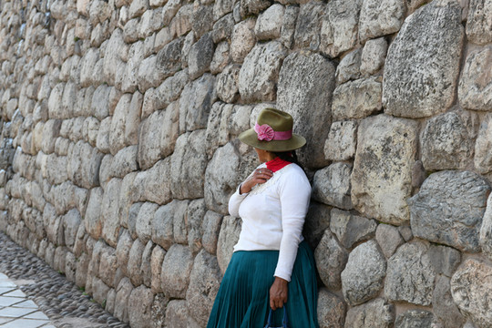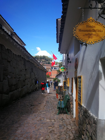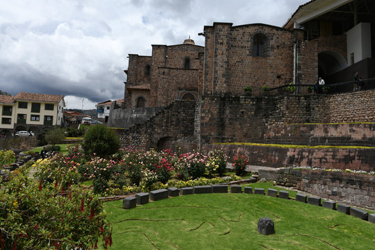 太阳神殿是我们参观的第一个景点,神殿是由最伟大的帝王帕恰库提统治鼎盛时期建造的,已有1000多年的历史,是印加文明的重要遗址。在当地语言中,意思是“金色的庭院"。西班牙人入侵后,把原来的主殿毁了,在此上面加盖了天主教堂。现在的神殿是一个带有围廊的二层西班牙式庭院,庭院中鲜花盛开,威严的钟楼给游人无尽的遐想。神殿最令人惊叹的是,西式建筑和印加遗址的巧妙结合,从四周围墙其断壁残垣中,游人能一瞥当时的辉煌。庭院的花园提供了良好的拍摄背景,太阳照射在回廊形成的斑斑阴影,显得错落有致。墙外的后花园面积很大,翠绿的草坪上摆放着很多巨石,多种鲜花盛开。