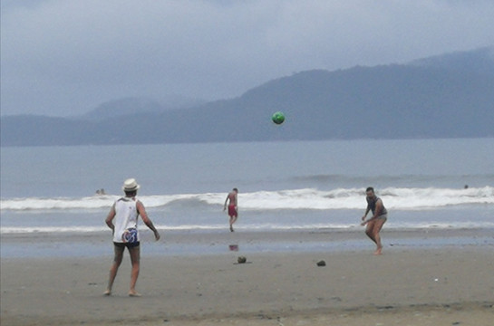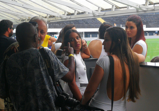 早餐后我们驱车前往圣保罗市以西70公里的港口城市桑托斯。城市很旧,历史遗迹突出。著名的桑托斯足球俱乐部就在这里,球王贝利早期在这里踢球。我们参观了该俱乐部的博物馆,馆内藏有各个时期比赛得冠的锦旗和奖杯,各个时期的队服和纪念品,我们到时正赶上场内有一场少年队的比赛,虽然是少年队的比赛,但场内观众很多,还有足球宝贝驻阵。在该市的海滩上,在小雨中也有很多当地人在踢足球,足球王国,不须此名。