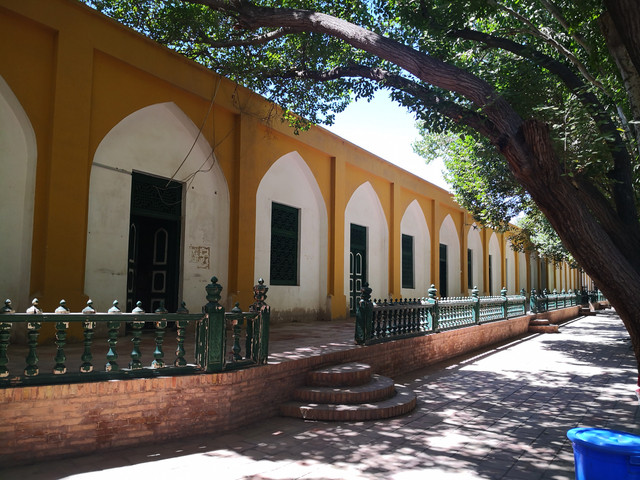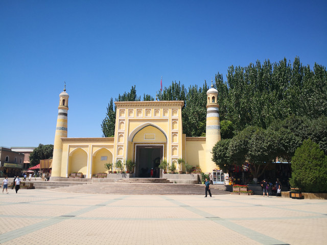 艾提尕尔清真寺是新疆地区伊斯兰著名清真寺,位于喀什市中心解放路,是喀什古城的象征,是中国最大的一座清真寺,始建于1442年,迄今已有500多年的历史。其实从喀什古城的另外一个侧门出去过马路就是这座全国规模最大的清真寺,也是亚洲最有影响的三大清真寺之一。其实进去后你会觉得这个头衔未必太过虚大,场内面积并不比我们一个商场面积那么庞大务必,反倒觉得是一处安逸格局逸人的小院子。但是这个地方对穆斯林的信徒来讲是一处意义非凡的圣地,暑期的喀什,每天都是大蓝天。正门朝东,米黄色的门楼高12.6米,天蓝色拱门高4.7米,宽4.3米,门的上方刻有阿拉伯文的《古兰经》。