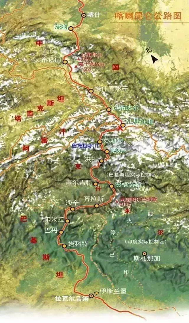 中国新疆段路线:喀什→奥依塔克红山→盖孜检查站(海拔:2200m)→喀克拉克湖(海拔:3300m)→卡拉库里湖(海拔:3615m)→苏巴什达坂口(海拔:4033m)→塔合曼→塔什库尔干(海拔:3055m)→达布达尔→红其拉甫国门(海拔:4733m)