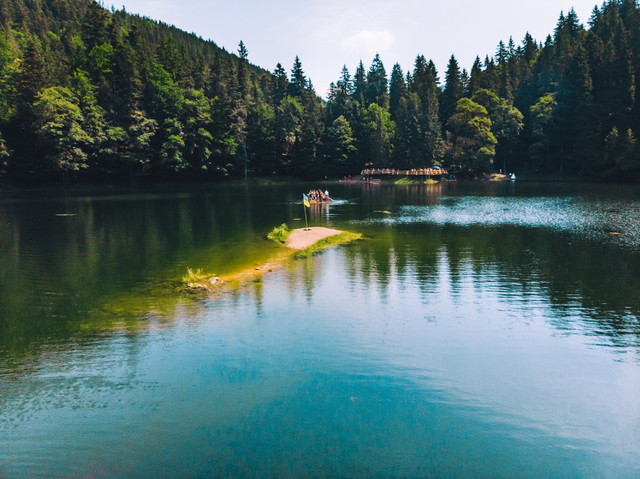 抑或邂逅Synevir和Nesamovyte 湖,看湖水清澈,倒映着阳光中的山脉。