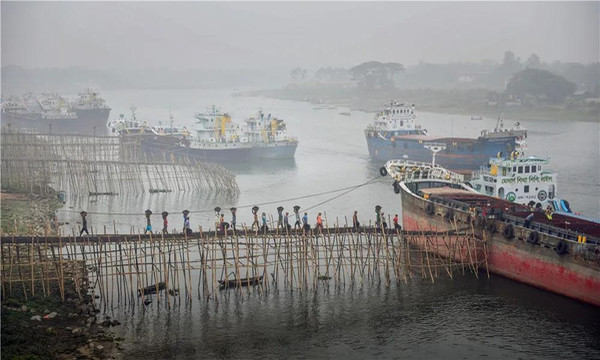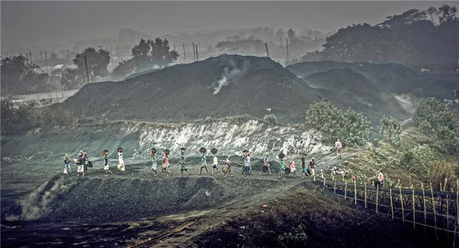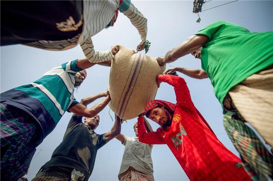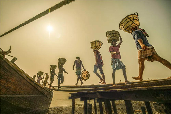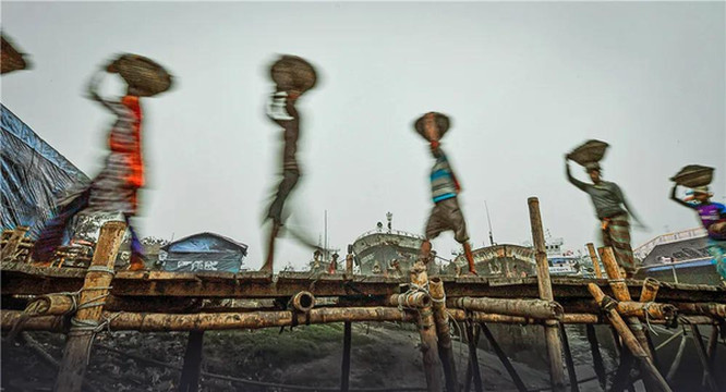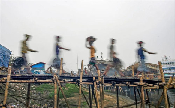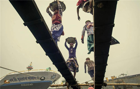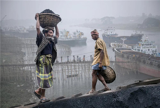 我们在孟加拉国采风途中,在粮食码头,煤堆场,盐仓库,鱼市场,砖窑厂等地,所到之处,看到那些本可以用机器搬动,传输的物品,但因为条件限制,财力所困,仍然采用人力搬运。