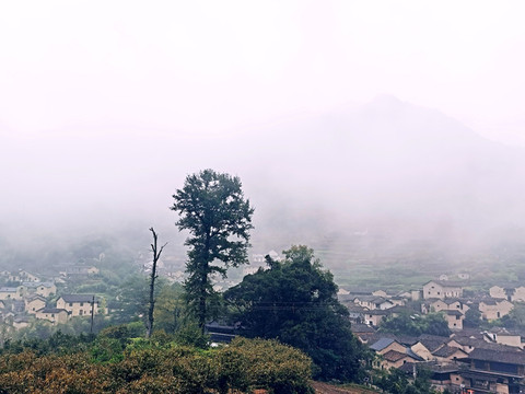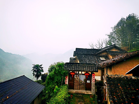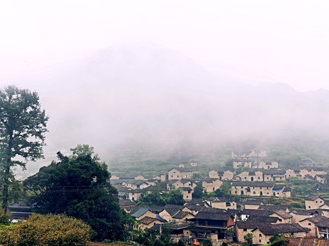 静谧的梁家山蒙上了一层氤氲的雾气,整个古村流淌在淡淡的墨色之间。这真是“岚雾今朝重,江山此地深”。