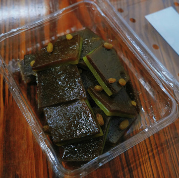 褐色与绿色交错的千层糕上点缀着葡萄干,我买的时候正好是最后一盒,也是着实有点畅销了。层层高升,岁岁甜蜜,都说这是武义人爱吃千层糕的原因。温润的天气让武义本地的粳米绵软而有嚼劲,千层糕就是用这种当地盛产的粳米做为主料,吃起来细腻、爽口、幽香、满口生香。